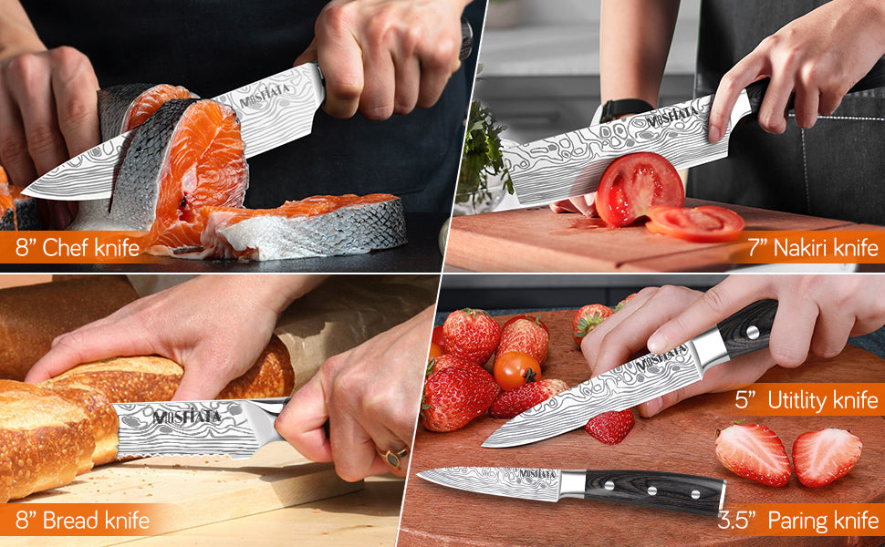 1.MOSFIATA 5PCS chef knife set include a 8-inch chef knife, 8-inch bread knife, a 7-inch nakiri knife, a 5-inch Utility Knife,and a 3.5-inch paring knife.