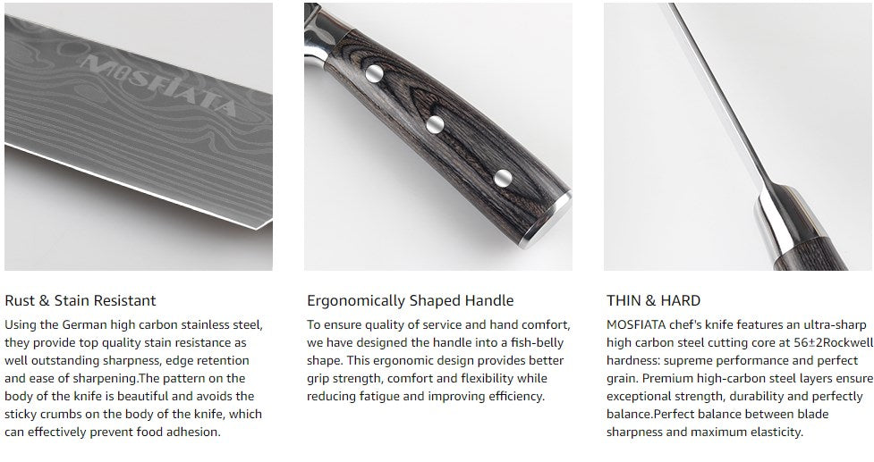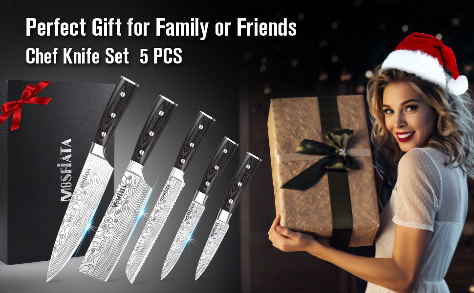 5.MOSFIATA kitchen knife set is equipped with scabbard and a premium box. It is an ideal gift of choice for birthday,wedding, anniversary,Mother's Day,Father's Day,Christmas,chef,family warmth and so on. If you have any questions,please feel free to contact us.
