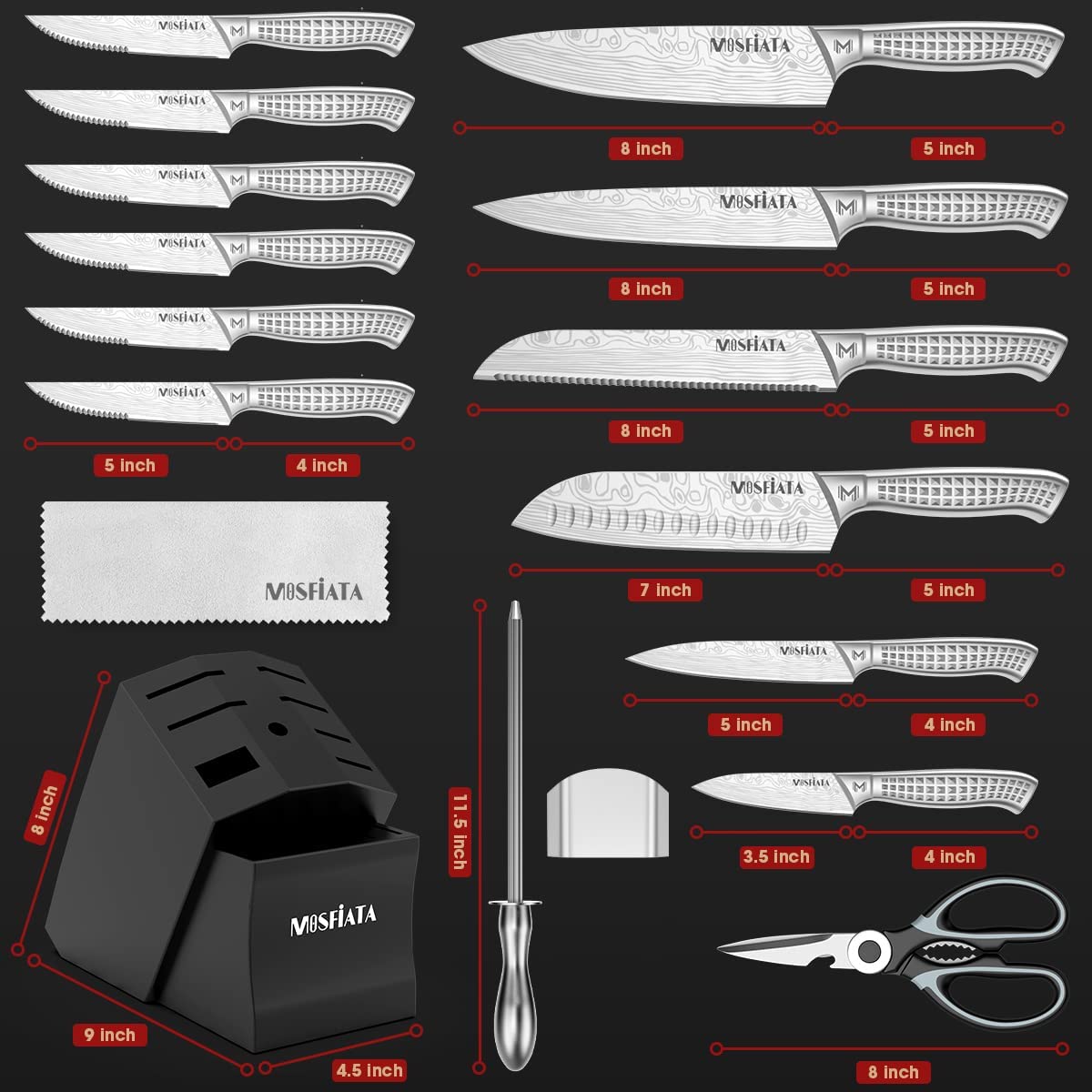 MOSFiATA Kitchen Knife Set, 17 Pieces Japan Stainless Steel Knife Sets for Kitchen with Block with Knife Sharpening Rod,Chefs,Santoku, Carving,Paring,6 Steak Knives & Shears, Dishwasher Safe, Silver