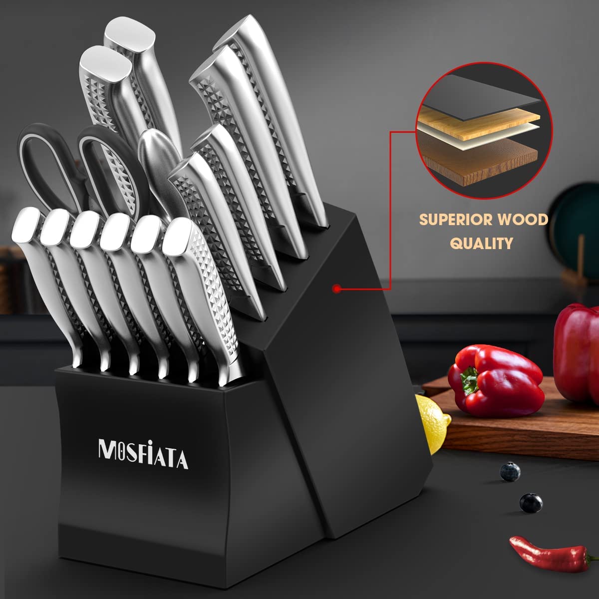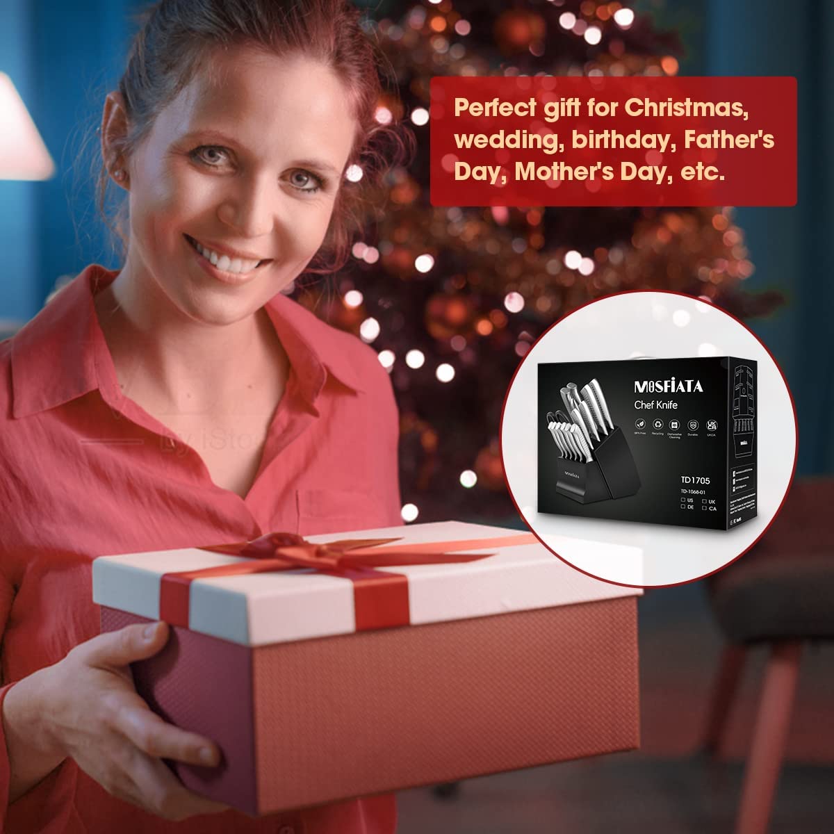 - IDEAL GIFT: MOSFIATA 17-piece stainless steel kitchen knife set with sheath and premium box. Ideal gift choice for birthdays, weddings, anniversaries, Mother's Day, Father's Day, Christmas, chef, etc. A necessity for daily family kitchen use.