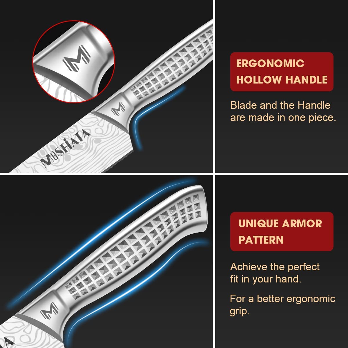 - HIGH QUALITY STAINLESS STEEL: kitchen knives contain 0.5-0.55% carbon; Rockwell hardness: 56+, rust and corrosion resistant for durability. Handle design inspired by ancient armor, one-piece casting molding. Three grip styles with good balance and comfortable grip. Knife set is dishwasher safe.