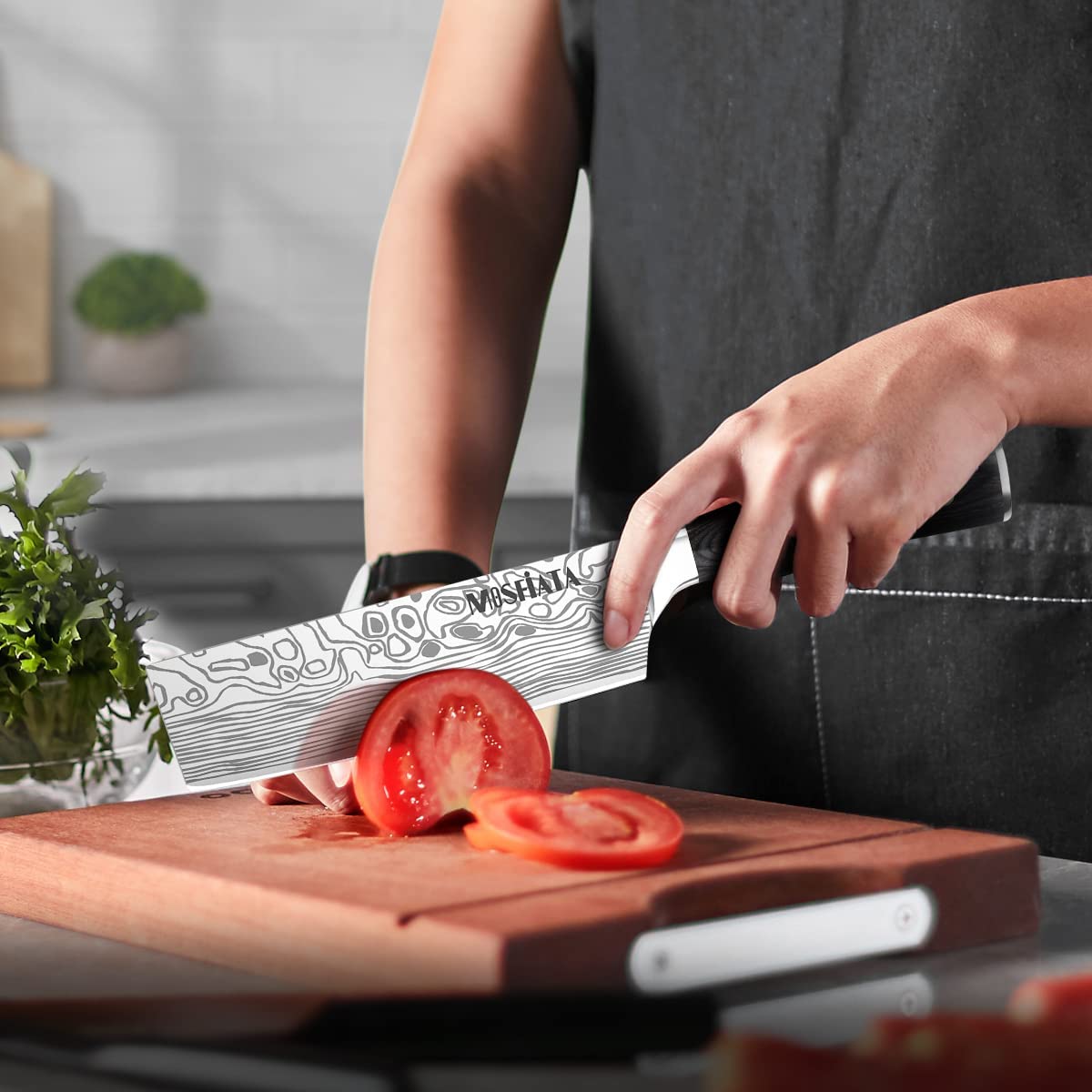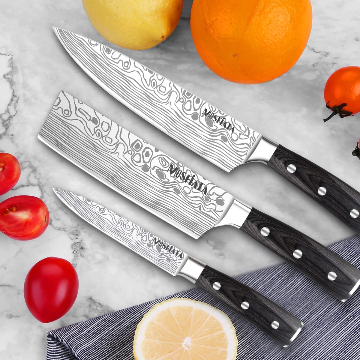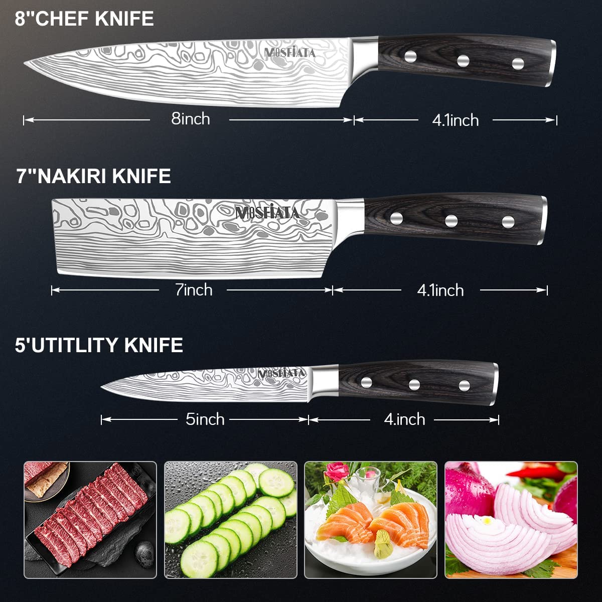 【Professional Kitchen Knife Set】MOSFIATA 3PCS chef knife set include a 8-inch chef knife,a 7-inch nakiri knife,and a 5-inch Utility Knife,they are the best choices for cutting,dicing,slicing,chopping vegetables fruits meats cheeses etc.